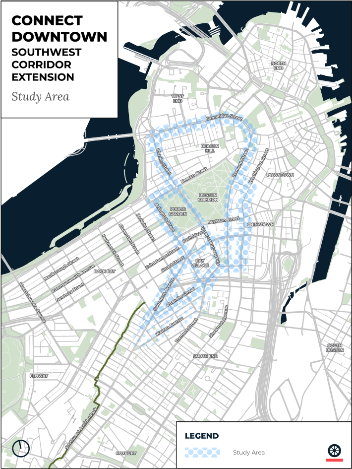 The city’s “Connect Downtown” project is studying a broad network of city streets around Boston Common and the Public Garden, from Columbus Avenue in the south to Charles Circle in the north (see the map at the top of this article).
