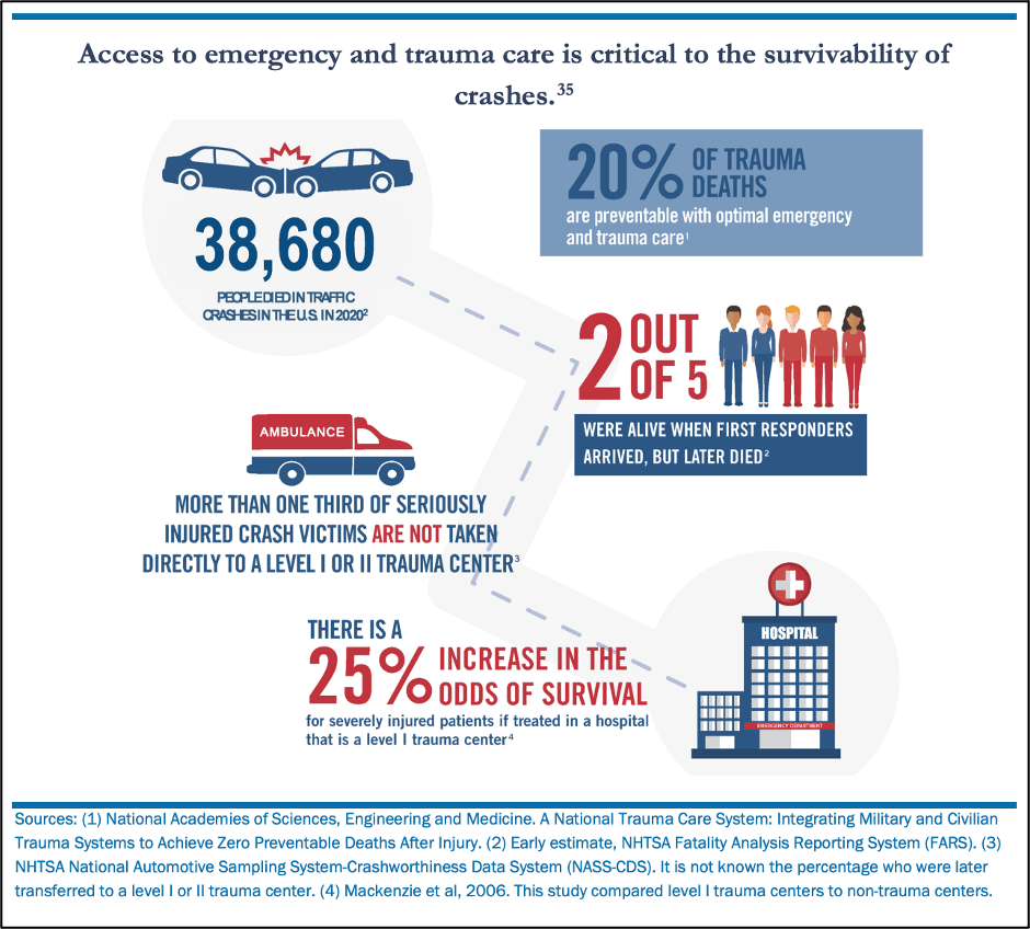 But the new Safety Strategy hopes to at least help them when they do, through new guidelines and resources aimed at helping high-quality medical care reach crash victims sooner and treat them with more success — a particularly problem in rural areas, where “about 39 percent of fatal crash victims do not arrive at a hospital for between one and two hours from the time of the crash, compared to ten percent in urban areas,” and who don’t always find a bed at a level one trauma center available if they do arrive alive and in time to get the help they need.