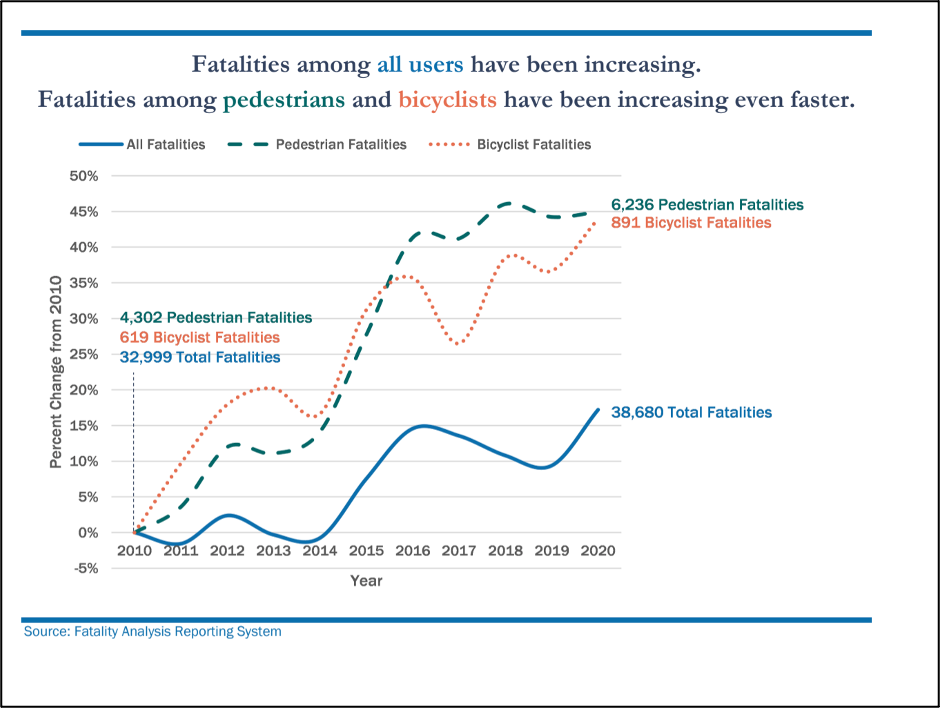 The agency also noted, equivocally, which groups have had the most alarming traffic violence trends over the last decade: Black and Indigenous people of color, rural road users, pedestrians, cyclists, and teenagers.