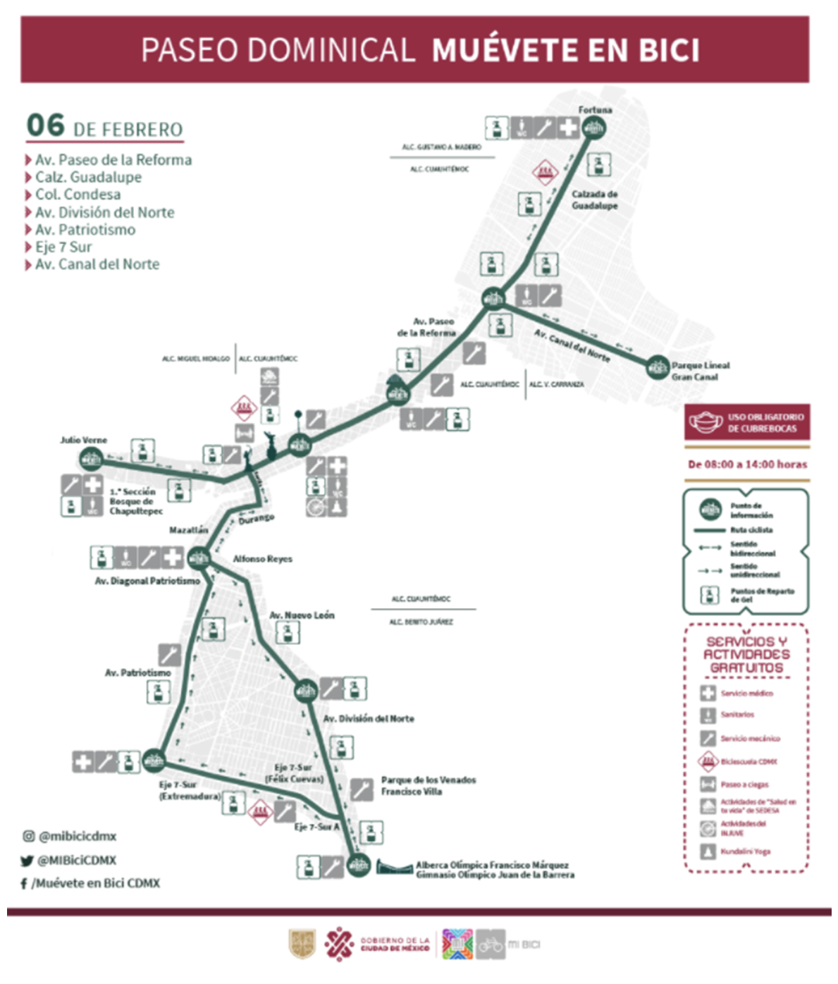 Los objetivos de este programa, Paseos Dominicales Muévete en Bici y Paseos Nocturnos, son aumentar la actividad física para la salud y el bienestar, promover la educación pública sobre el ciclismo, lo que incluye permitir que las personas desarrollen la confianza para usar una bicicleta como medio de transporte, y promover el uso de bicicletas como una forma sostenible de transporte y recreación. Este programa es dirigido por la Secretaría de Movilidad, pero comenzó bajo la Secretaría de Medio Ambiente de la Ciudad de México en mayo de 2007, inicialmente peatonalizado una de las carreteras principales de la ciudad que se llama Paseo de la Reforma. La ruta original era de 6,2 millas (10k). En 2014, cuando Chicago termino su programa Calles Abiertas debido a problemas de financiación, la Ciudad de México agregó más y más calles al suyo. Hoy, el programa incluye más de 31 millas (50k) de la ciudad. Esta implementación solo se encuentra en la Ciudad de México. Otras ciudades mexicanas como Guadalajara, Mérida y Puebla también tienen ciclovías.