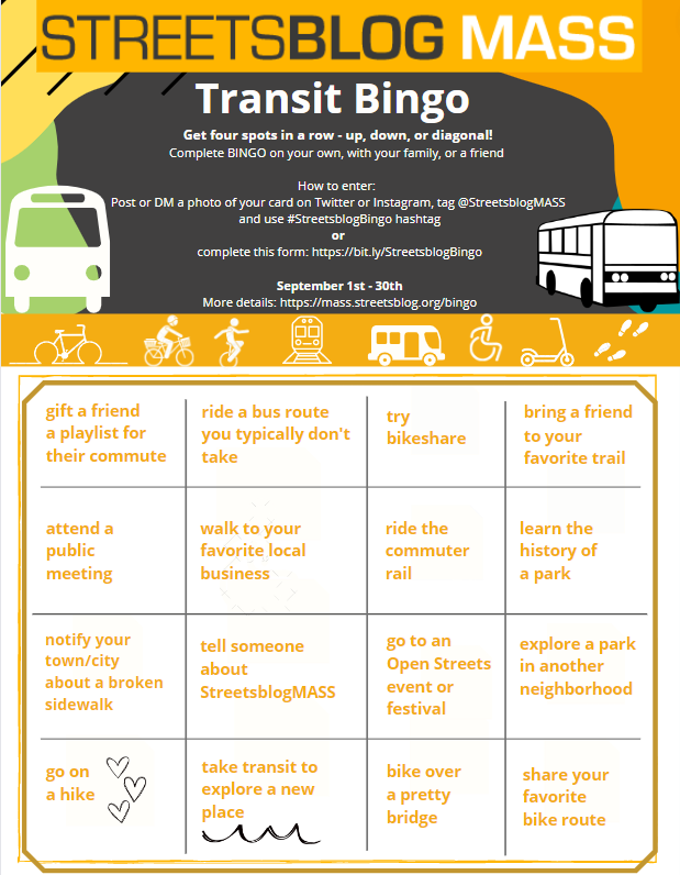 We’d love to keep up with your transit, bus, bike, and park adventures! Keep us posted by tagging us on social media (@StreesblogMASS) when you finish a square on your bingo card. Please let us know who to credit for the photo, as we may share them on the Streetsblog website or on social media (and also please let us know if you DO NOT want your photos shared).