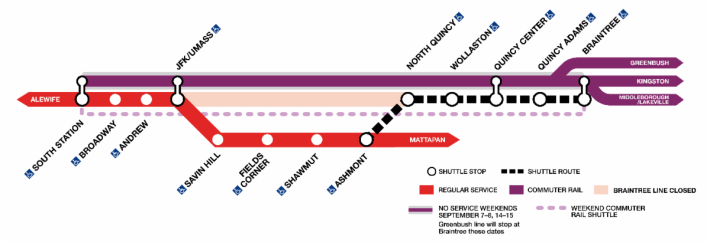 - However, during the weekends of September 7-8 and September 14-15, these Commuter Rail lines will be replaced with shuttle bus service between South Station and Braintree.