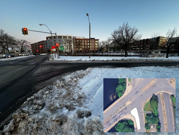 Reader Sam Ellington sent us these photos of a massive sneckdown where the Paul Dudley White Path crosses the end of the Arsenal Street Bridge at Soldier's Field Road: