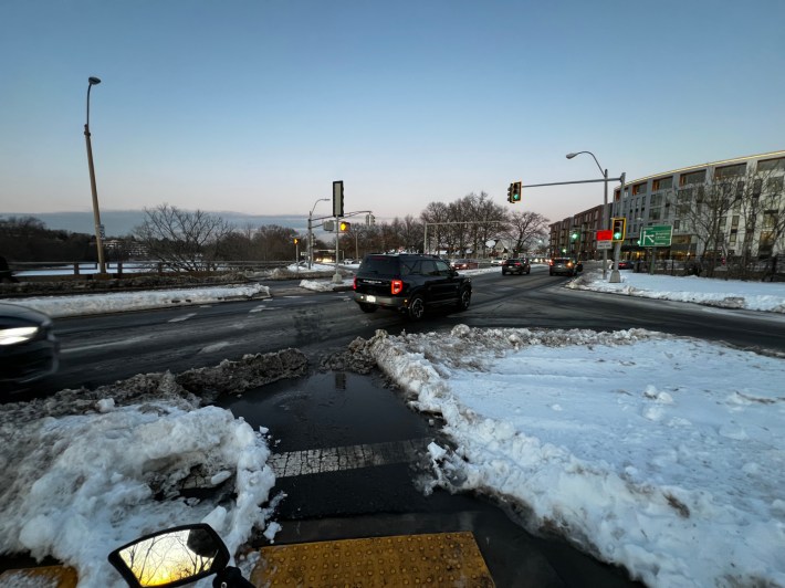 This one is noteworthy because the unnecessarily wide highway ramps squeeze the riverfront bike and jogging path into a narrow, crowded pinch point here. DCR's plow drivers seem to understand that the agency could create a lot more green space for bikes and pedestrians at this intersection.