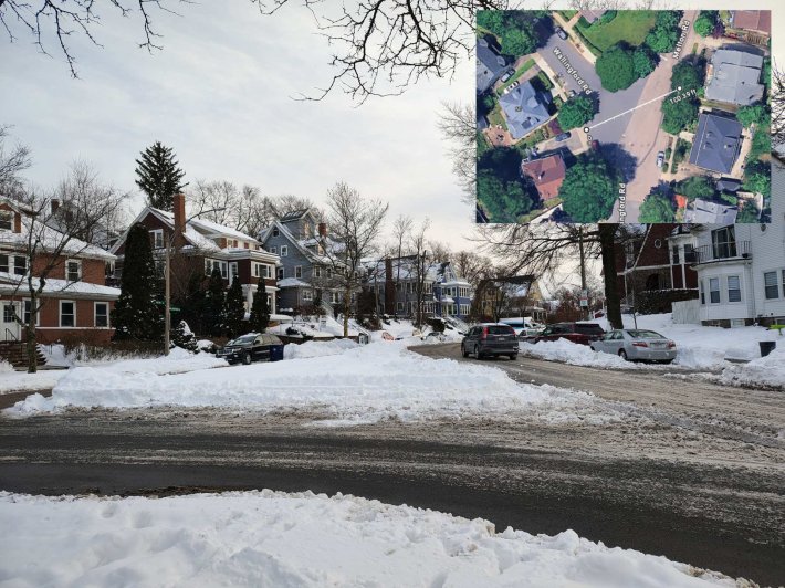 One reader sent in this photo from the corner of Melton Road and Wallingford Road in Brighton. A massive wedge of untouched snow in the middle of this Y-shaped intersection suggests that the City of Boston could swap out a field of asphalt for a nice new neighborhood park: