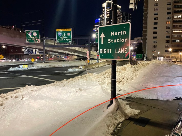 And here's the off-ramp from Storrow Drive to Martha Road near the Science Park Green Line station, pictured on the evening of Feb. 3, eight days after the snowstorm: