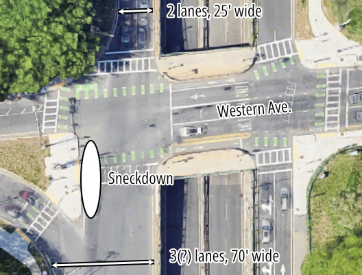 But south of the traffic light, the same roadway bloats to a width of over 70 feet with three poorly-marked lanes.