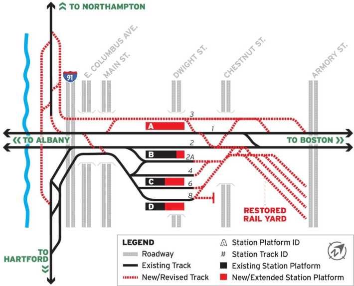 The Springfield station is an interchange point between the north-south railroad along the Connecticut River and the east-west railway that connects to Boston. MassDOT's project would upgrade signal systems and add new switches and crossovers to accommodate more train traffic through the area.